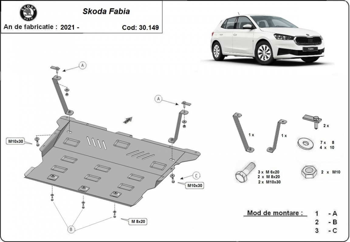 Skid plate for the protection of the: engine, gearbox, radiator, front bumper The skid plate is new and fits perfectly for all versions of Skoda Fabia manufactured between 2021 and 2026. Made out of 2 mm thick Steel plate. Screws, nuts, clips, all fastening accessories are included. All skid plates are powder coated to prevent corrosion. The exterior of the skid plate is provided with Steel reinforcements, which increases the resistance to impact. |