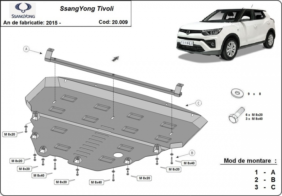 Skid plate for the protection of the: engine, gearbox, radiator The skid plate is new and fits perfectly for all versions of SsangYong Tivoli manufactured between 2015 and 2023. Made out of 2 mm thick Steel plate. Screws, nuts, clips, all fastening accessories are included. All skid plates are powder coated to prevent corrosion. The exterior of the skid plate is provided with Steel reinforcements, which increases the resistance to impact. |