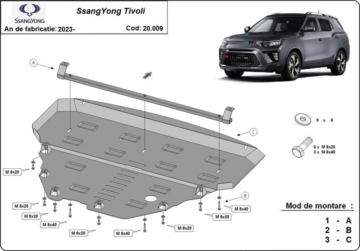 Skid plate for the protection of the: engine, gearbox, radiator The skid plate is new and fits perfectly for all versions of SsangYong Tivoli manufactured between 2023 and 2026. Made out of 2 mm thick Steel plate. Screws, nuts, clips, all fastening accessories are included. All skid plates are powder coated to prevent corrosion. The exterior of the skid plate is provided with Steel reinforcements, which increases the resistance to impact. |