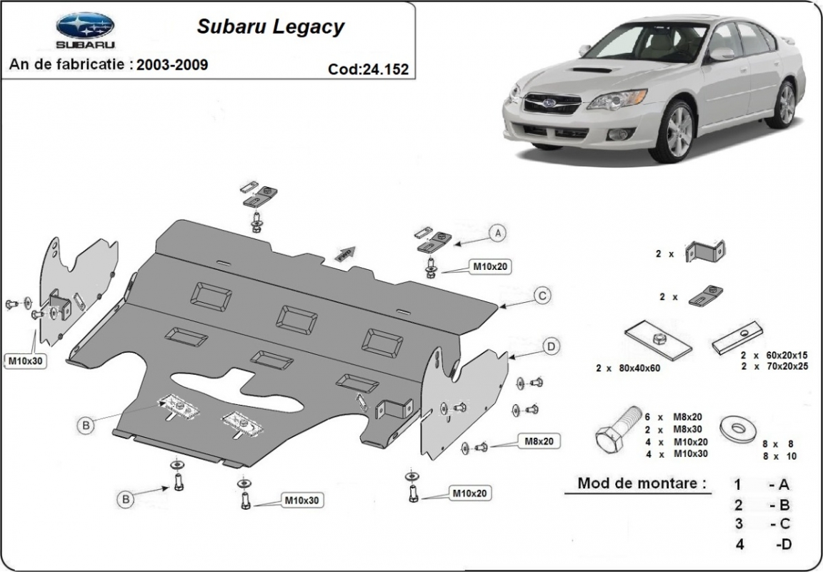 Skid plate for the protection of the: engine, radiator The skid plate is new and fits perfectly for all versions of Subaru Legacy IV manufactured between 2003 and 2009. Made out of 2 mm thick Steel plate. Screws, nuts, clips, all fastening accessories are included. All skid plates are powder coated to prevent corrosion. The exterior of the skid plate is provided with Steel reinforcements, which increases the resistance to impact. |