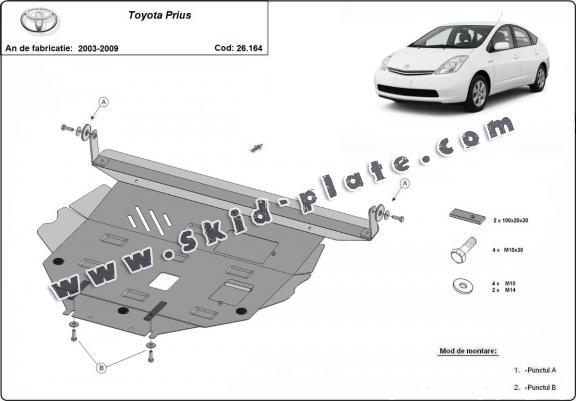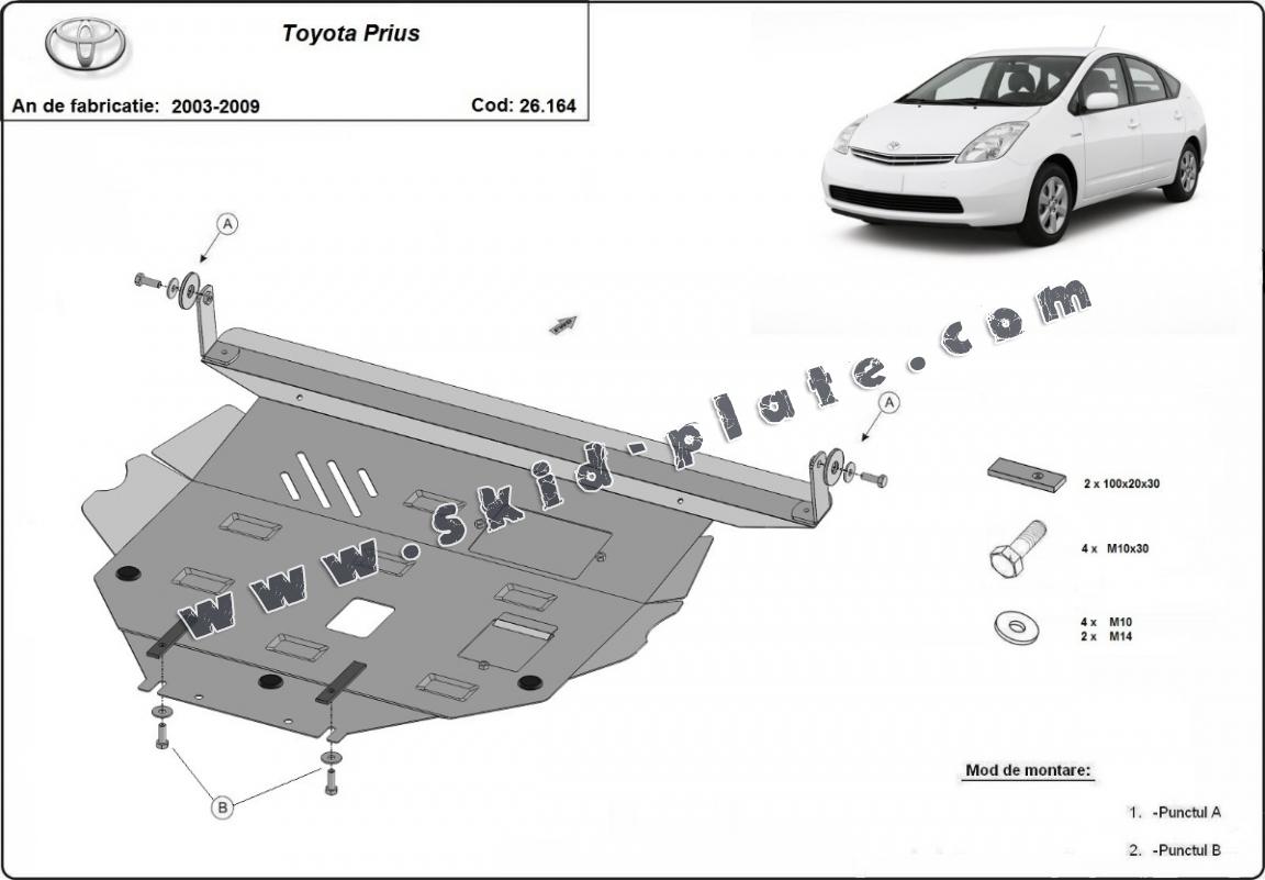 Skid plate for the protection of the: engine, gearbox, radiator The skid plate is new and fits perfectly for all versions of Toyota Prius manufactured between 2003 and 2009. Made out of 2 mm thick Steel plate. Screws, nuts, clips, all fastening accessories are included. All skid plates are powder coated to prevent corrosion. The exterior of the skid plate is provided with Steel reinforcements, which increases the resistance to impact. |