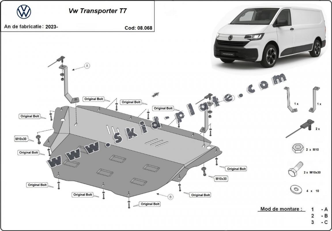 Skid plate for the protection of the: engine, gearbox, radiator The skid plate is new and fits perfectly for all versions of Volkswagen Transporter T7 Van manufactured between 2023 and 2025. Made out of 2 mm thick Steel plate. Screws, nuts, clips, all fastening accessories are included. All skid plates are powder coated to prevent corrosion. The exterior of the skid plate is provided with Steel reinforcements, which increases the resistance to impact. |