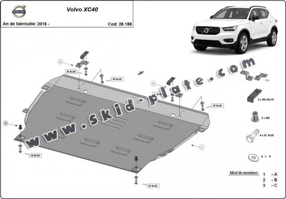 Skid plate for the protection of the: engine, gearbox, radiator The skid plate is new and fits perfectly for all versions of Volvo XC40 manufactured between 2018 and 2025. Made out of 2 mm thick Steel plate. Screws, nuts, clips, all fastening accessories are included. All skid plates are powder coated to prevent corrosion. The exterior of the skid plate is provided with Steel reinforcements, which increases the resistance to impact. |